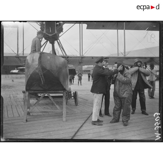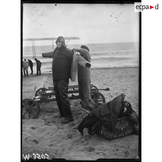 Saint-Raphaël, journaliste américain se mettant en combinaison d'aviateur.