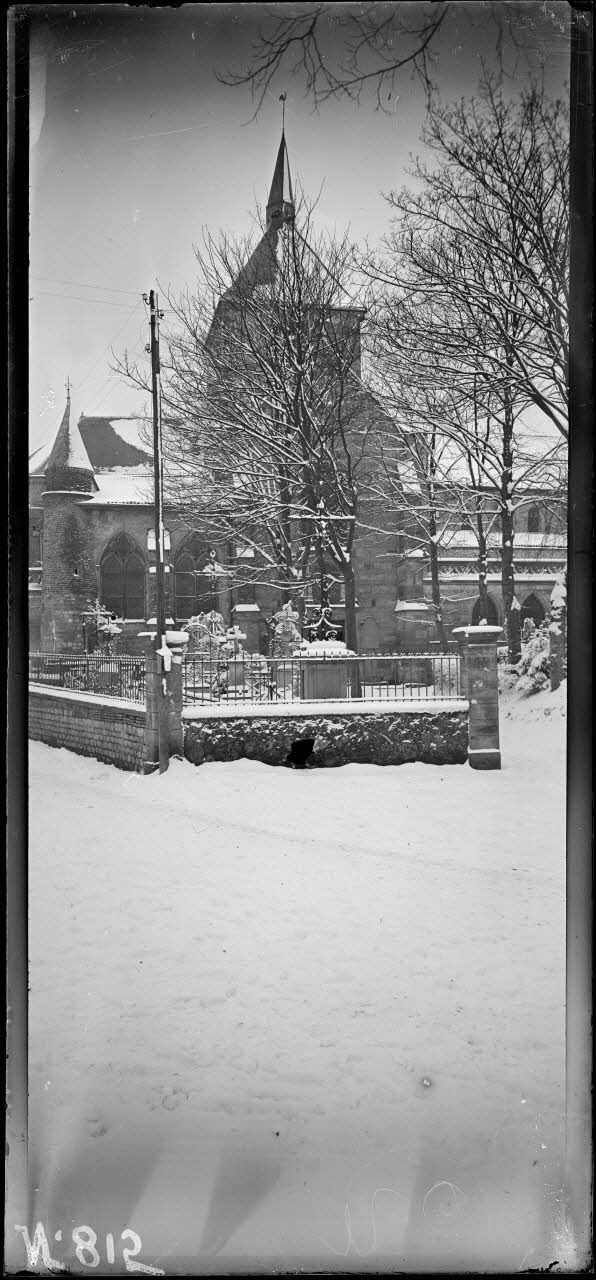 Sainte Menehould. Eglise et cimetière sous la neige (janv. 1917). [légende d'origine]