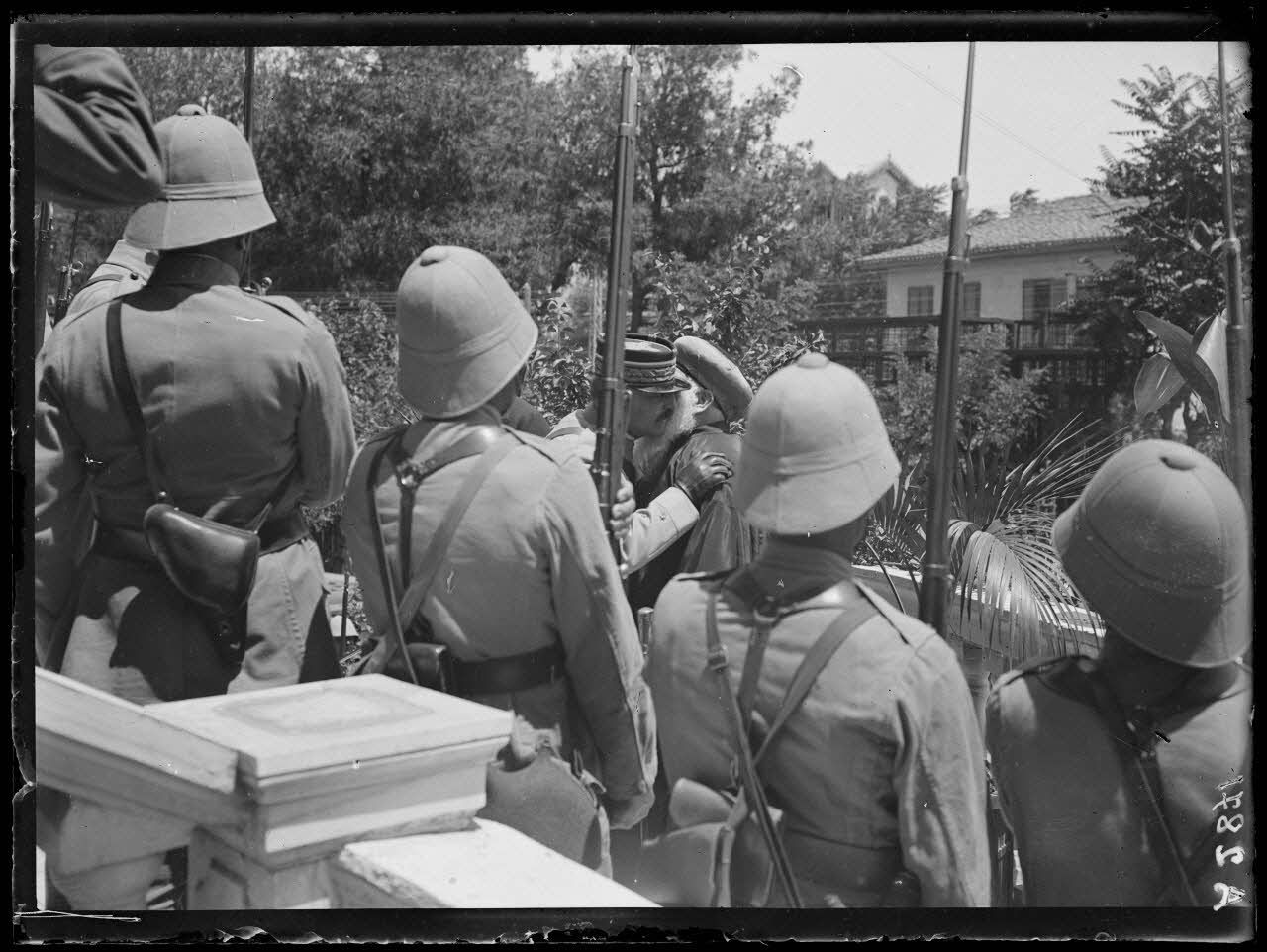 Le général Franchet d'Espèrey arrive en visite à Salonique. Sont présents le général Henrys, le général serbe Bojovitch, M. Krajevski, représentant la France auprès du gouvernement albanais, le général Charpy, les généraux Paraskévopoulos et Mavrojannis, le général Milne (A 2861), commandant les forces anglaises, le général Fourniel, directeur du service de santé, M de Billy, ministre de France, l'amiral Merveilleux du Vignaux, le grand rabbin Jacob Meïr, qui reçoit la légion d'honneur, M. Anghelakis, maire de Salonique.