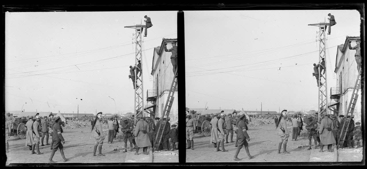 Salonique. Après le bombardement, on répare les fils rompus. [légende d'origine]