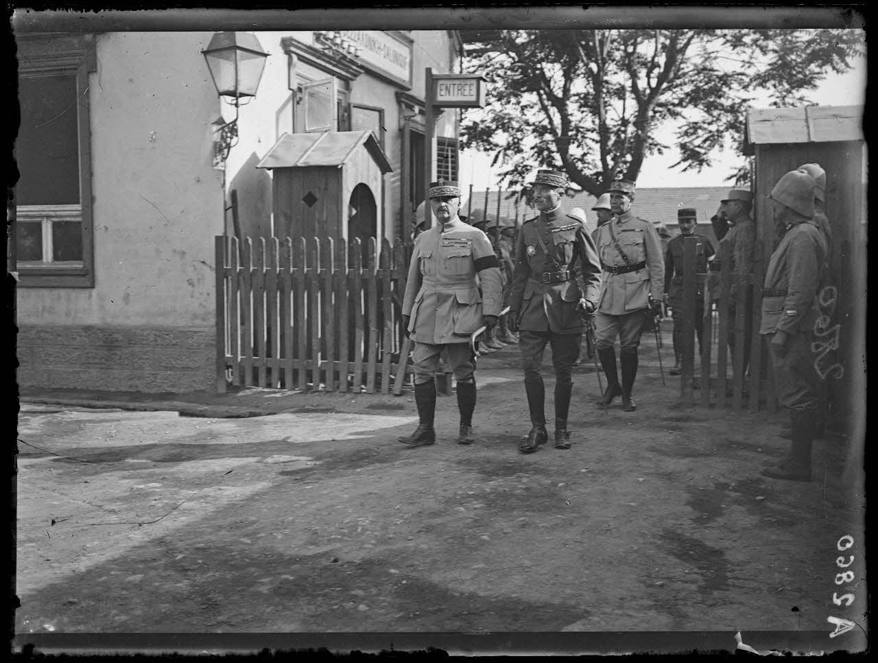 Salonique. Arrivée du Général Franchet d'Espèrey à la gare des Orientaux, le Général Franchet d'Espèrey accompagné du Général Henrys sort de la gare (18.6.18). [légende d'origine]