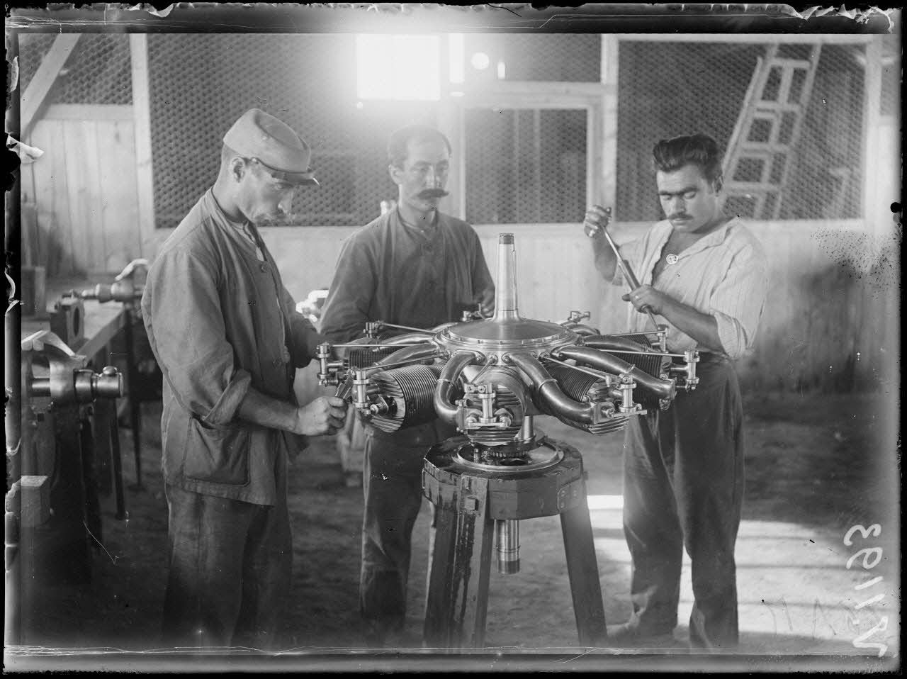 Salonique. Aviation militaire. Montage d'un moteur fixe 12 cylindres 130 HP De Dion.