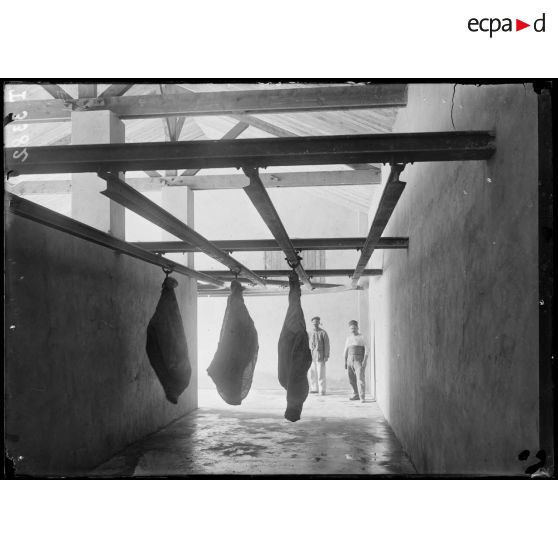 Salonique. Etablissement frigorifique de l'armée. Pièce spéciale pour la viande en partance vers le front.
