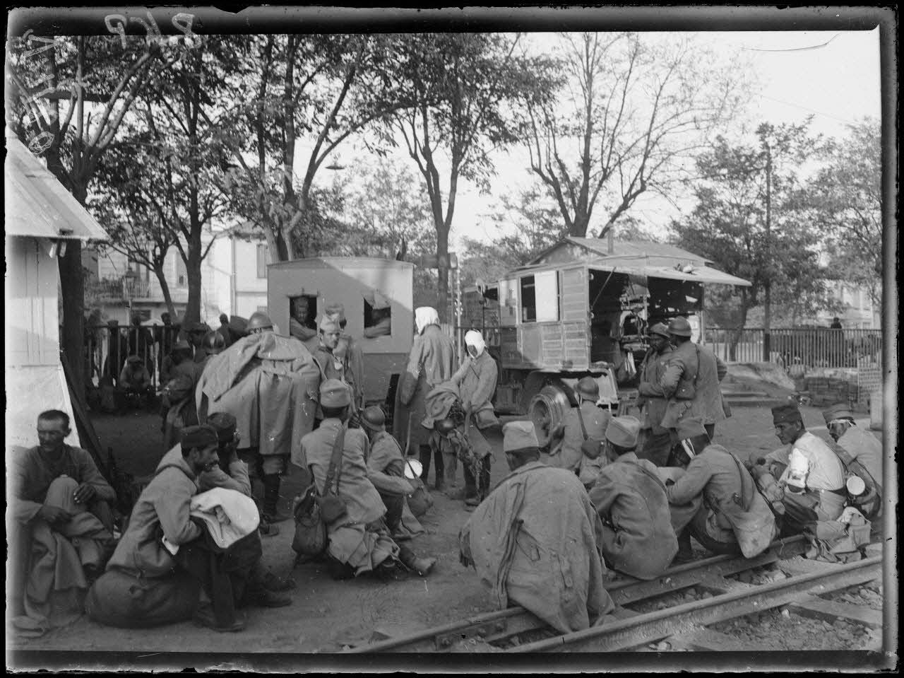 Des malades et des blessés sont évacués vers la gare des Orientaux de la ville. Des soldats de la Section photographique de l'Armée d'Orient (SPA) sont présents sur le site.