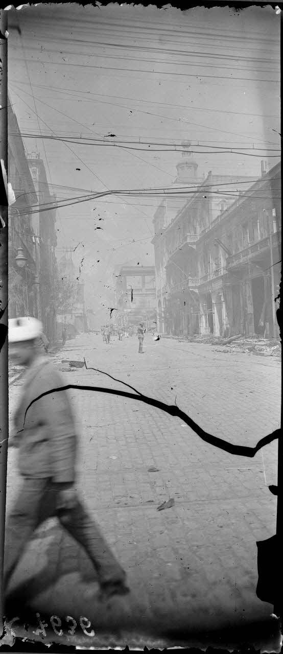 Les dégâts et les victimes dans Salonique après l'incendie qui a ravagé la ville les 18 et 19 août 1917. Le feu a détruit plus de 30 % de la cité, des milliers de bâtiments, touché plusieurs quartiers, laissé des milliers de personnes sans abri et causé de nombreuses victimes. Ici, dans les rues et sur les places de la Liberté et du marché, les ruines s'amoncellent et les sinistrés errent à travers les décombres.