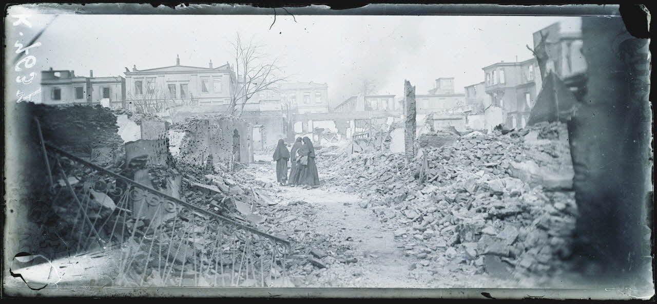 Les dégâts et les victimes dans Salonique après l'incendie qui a ravagé la ville les 18 et 19 août 1917. Le feu a détruit plus de 30 % de la cité, des milliers de bâtiments, touché plusieurs quartiers, laissé des milliers de personnes sans abri et causé de nombreuses victimes. Ici, dans les rues et sur les places de la Liberté et du marché, les ruines s'amoncellent et les sinistrés errent à travers les décombres.