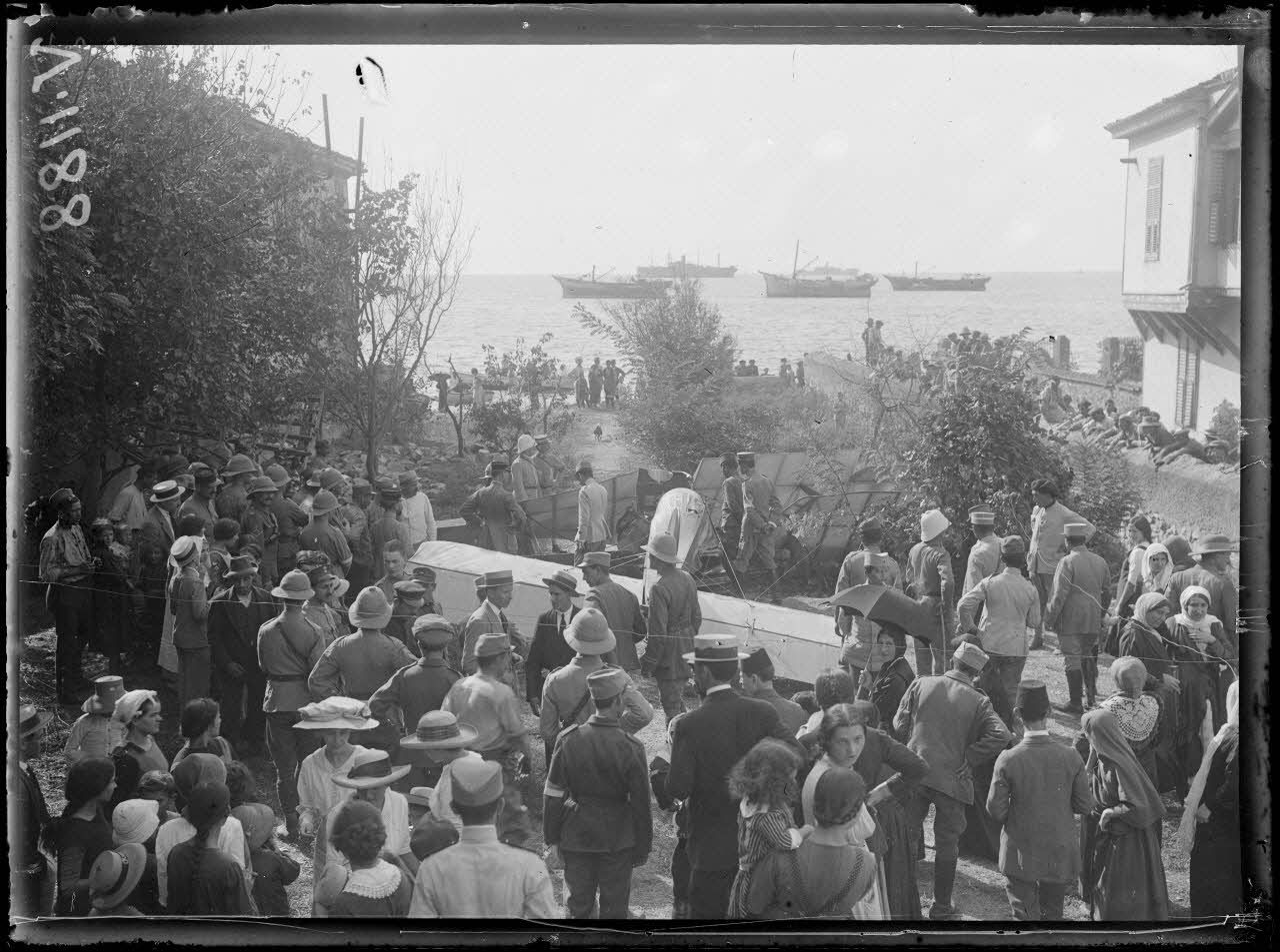 Salonique. Le lieutenant Delac tombé d'avion dans un jardin du quartier des Campagnes. La foule regardant l'appareil. [légende d'origine]