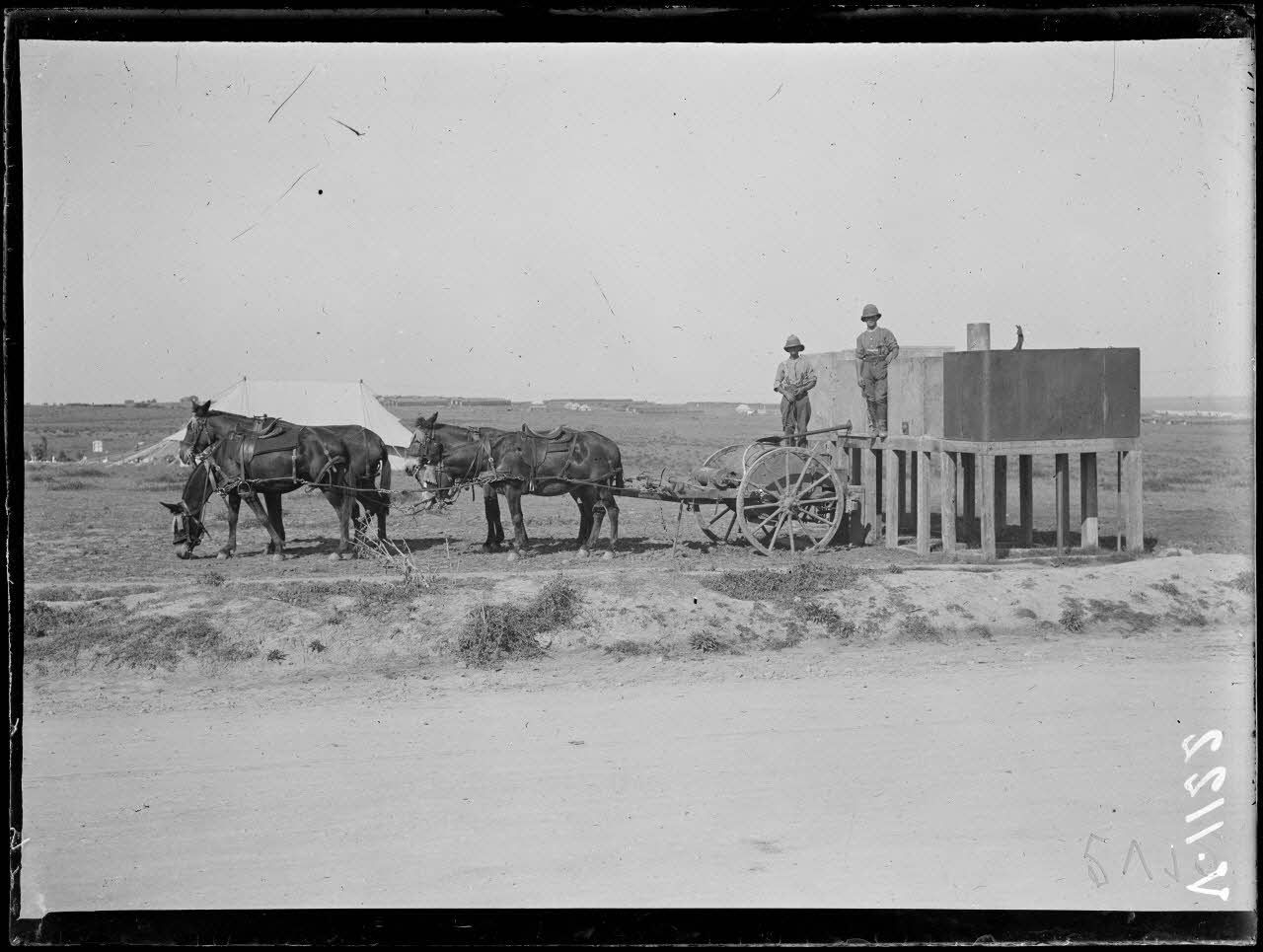 A quelques kilomètres du front balkanique, le camp de Salonique est occupé par la cavalerie anglaise et des pièces d'infanterie collective comme des mitrailleuses anglaises Vickers mises en batterie par des soldats australiens (V 1123).