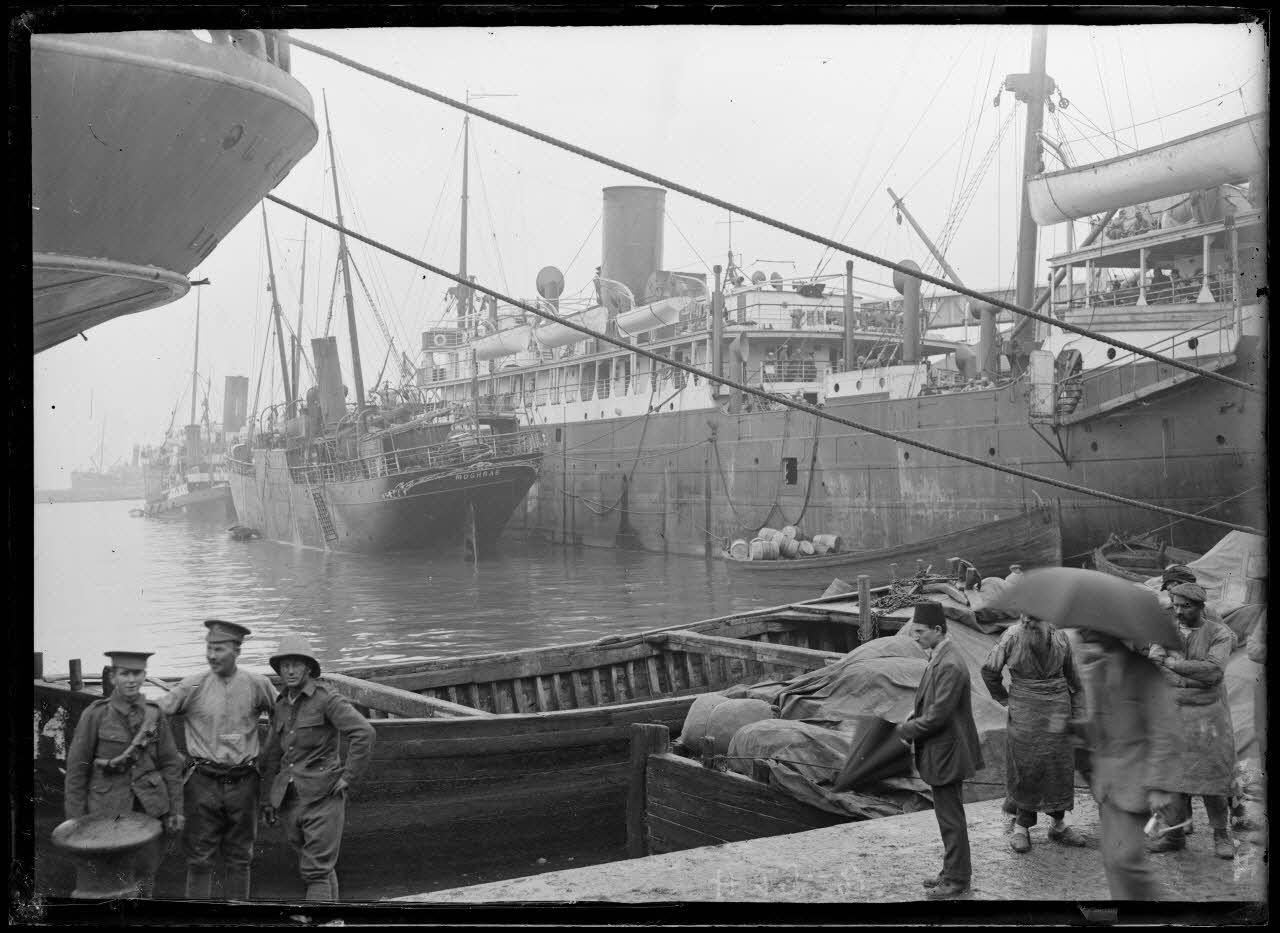 - Le 18 octobre, sur un coin de quai, les bâtiments français le Médié et le Moghrab débarquent. Le 2e RMZ (régiment de marche des zouaves) met pied à terre. Les arabas (chariots à boeufs) du 2e RMZ sont chargés de matériel. Un quai est déstiné au débarquement des troupes anglaises et de leur matériel. Sur le port, le général Sarrail, commandant l'armée d'orient, sort des bureaux de son état-major. Le repas est distribué sur les quais.