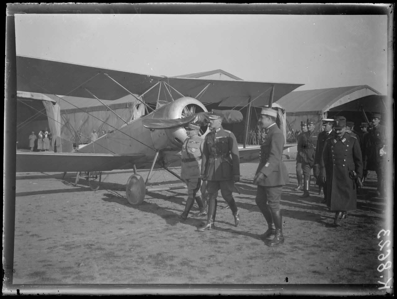 Salonique. Visite du Roi de Grèce au camp d'aviation. Le Roi passe devant les appareils, derrière le général Guillaumat.