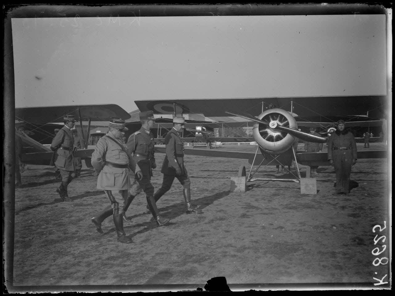 Salonique. Visite du Roi de Grèce au camp d'aviation. Le Roi et le général Guillaumat passent devant les avions de chasse. [légende d'origine]