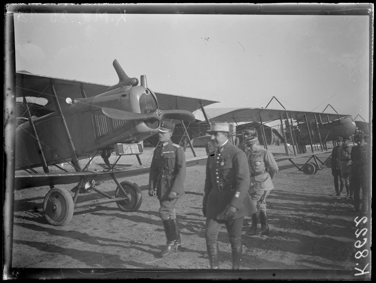 Salonique. Visite du Roi de Grèce au camp d'aviation. Le Roi passe devant les appareils, derrière le général Guillaumat. [légende d'origine]