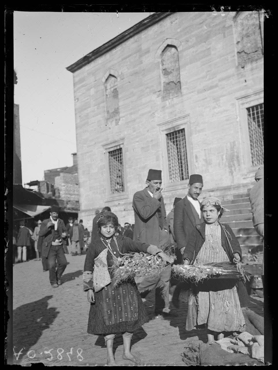 [Scène de la vie quotidienne : des jeunes filles vendent des légumes sur un marché, dans une ville en Turquie.]
