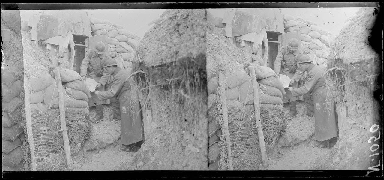 - Dans le secteur de Souain, au PC de l'Etoile, dans le bois de la Chaise, des abris souterrains sont occupés par les soldats. Un guetteur surveille les lignes ennemies.
