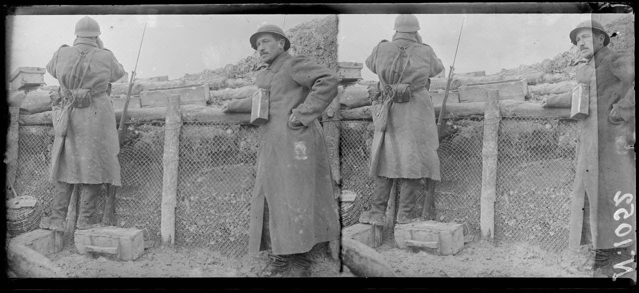 - Dans le secteur de Souain, au PC de l'Etoile, dans le bois de la Chaise, des abris souterrains sont occupés par les soldats. Un guetteur surveille les lignes ennemies.