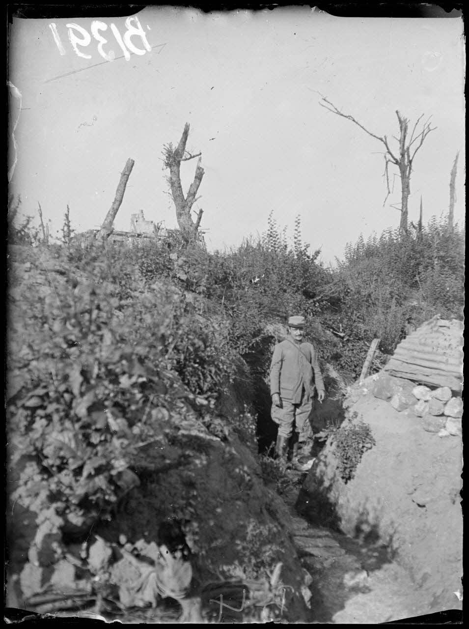 Secteur de la ferme de Quennevières : tranchée démantelée par les obus devant la ferme. [légende d’origine]