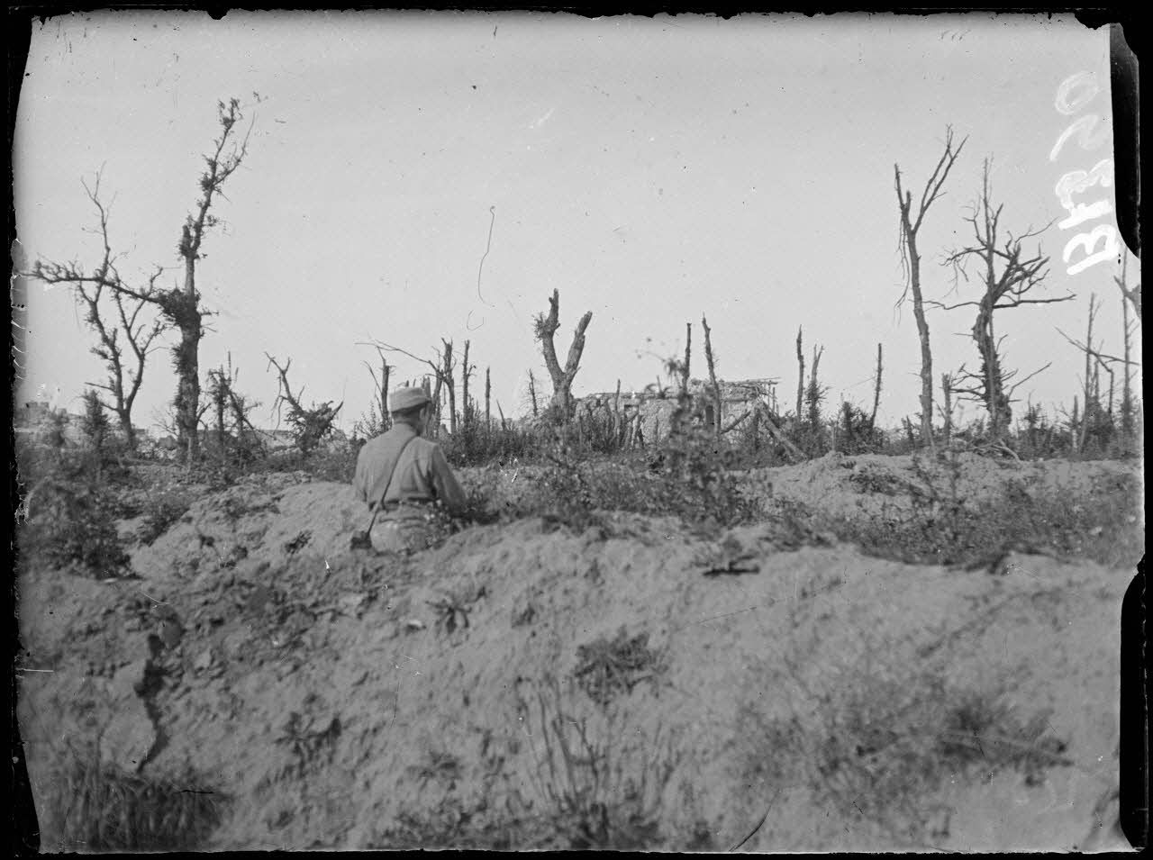 Secteur de la ferme de Quennevières : tranchée démantelée par les obus devant la ferme.