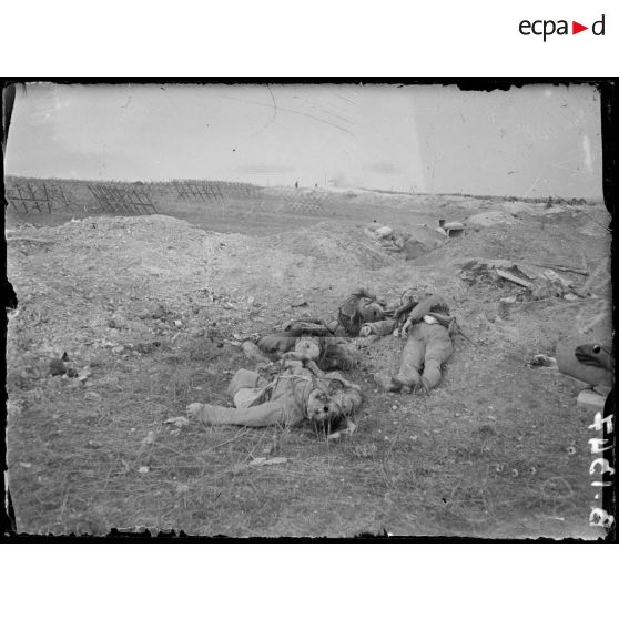 Secteur du bois Bricot (Marne), région de Perthes. Cadavre allemand près de la fosse où il doit être enseveli.
