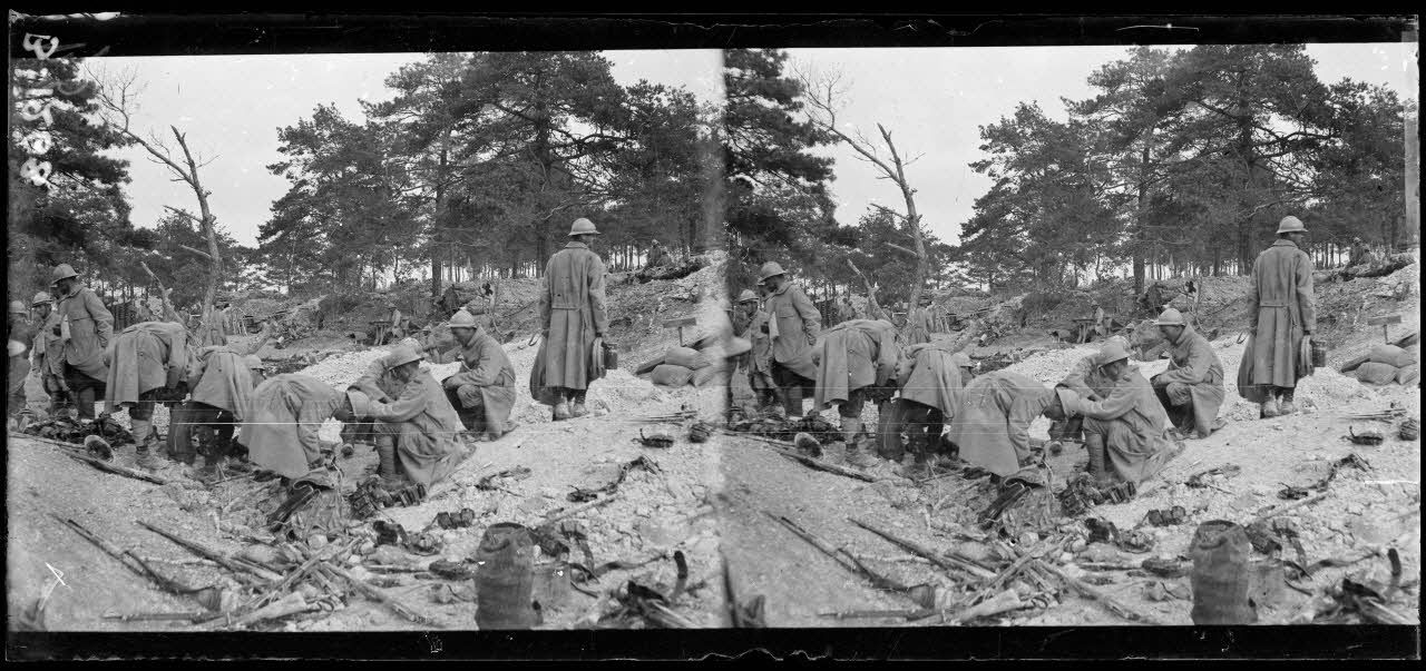 Secteur du bois Bricot (Marne), région de Perthes. Blessés allemands soignés par des Français et transport de cadavres.