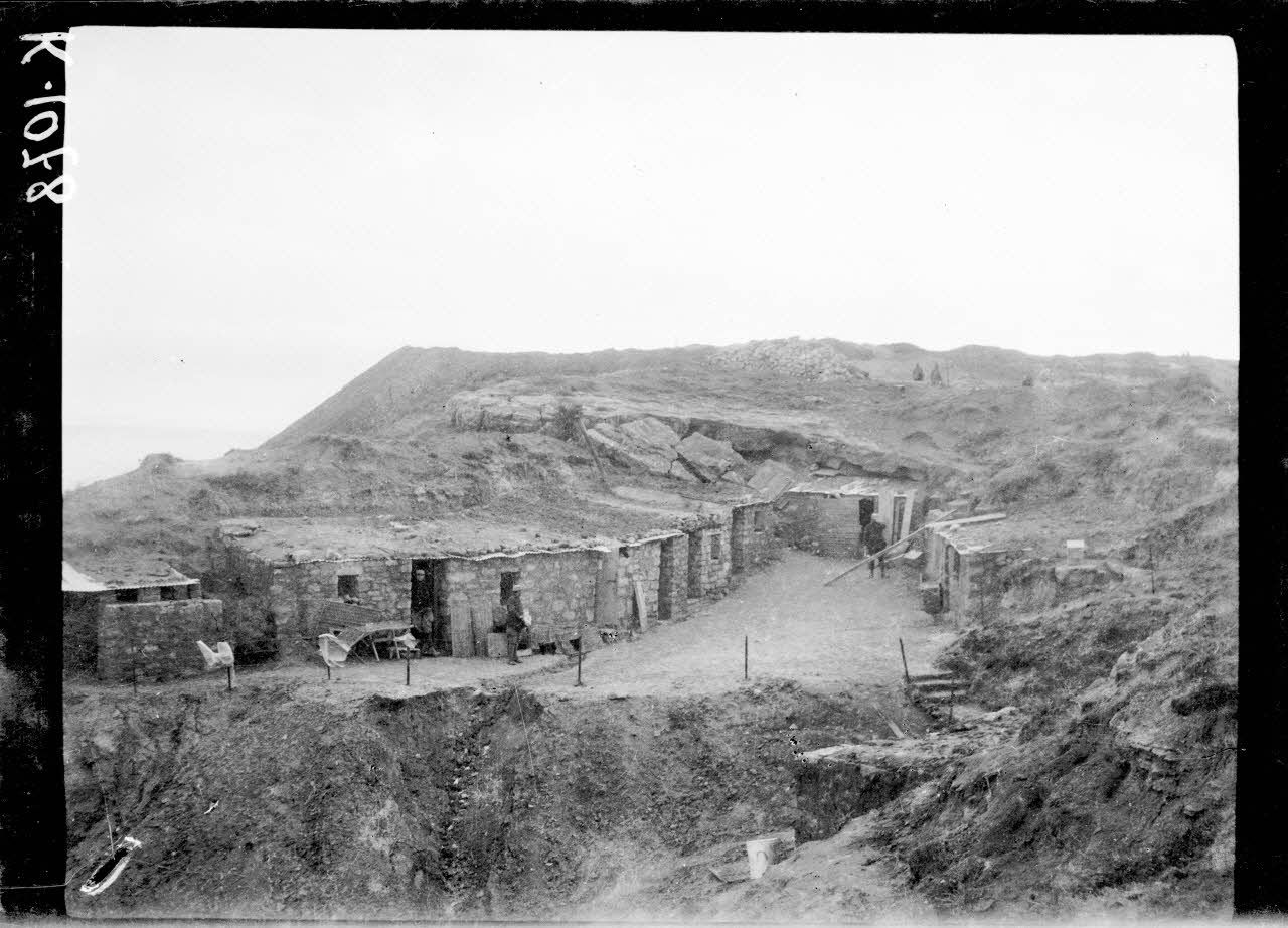 Seddul Bahr. Cagnas du 58e colonial sur la falaise qui domine le port français. [légende d'origine]