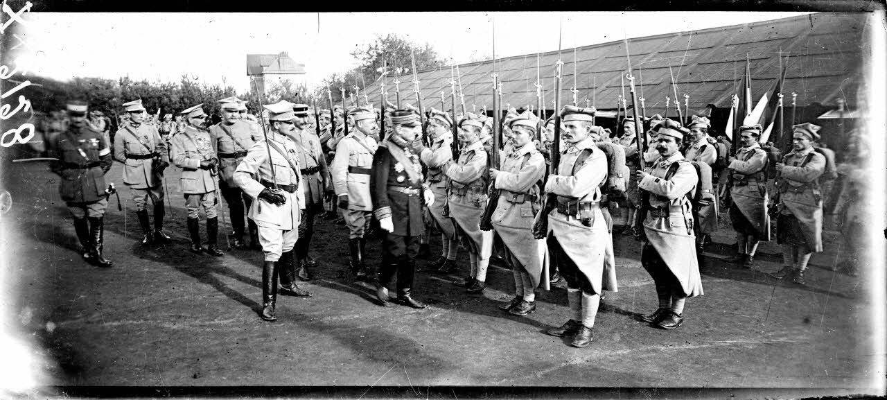 Sillé-le-Guillaume (Sarthe), camp du 1er bataillon polonais, le général Archinard décore un capitaine du 1er bataillon polonais.