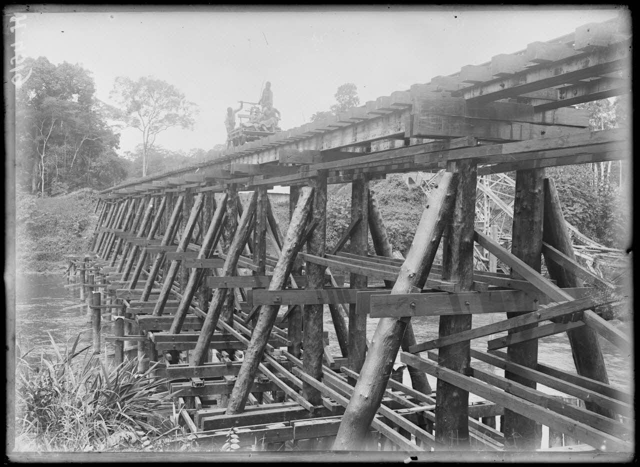- Un train passe sur la nouvelle estacade construit par un contingent du génie français. Le chemin de fer s'enfonce dans la forêt vierge. Une tranchée a aussi été construite pour la nouvelle voie ferrée.