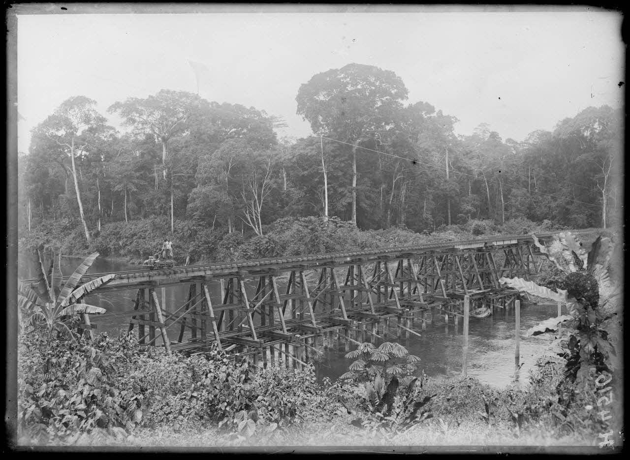 - Un train passe sur la nouvelle estacade construit par un contingent du génie français. Le chemin de fer s'enfonce dans la forêt vierge. Une tranchée a aussi été construite pour la nouvelle voie ferrée.