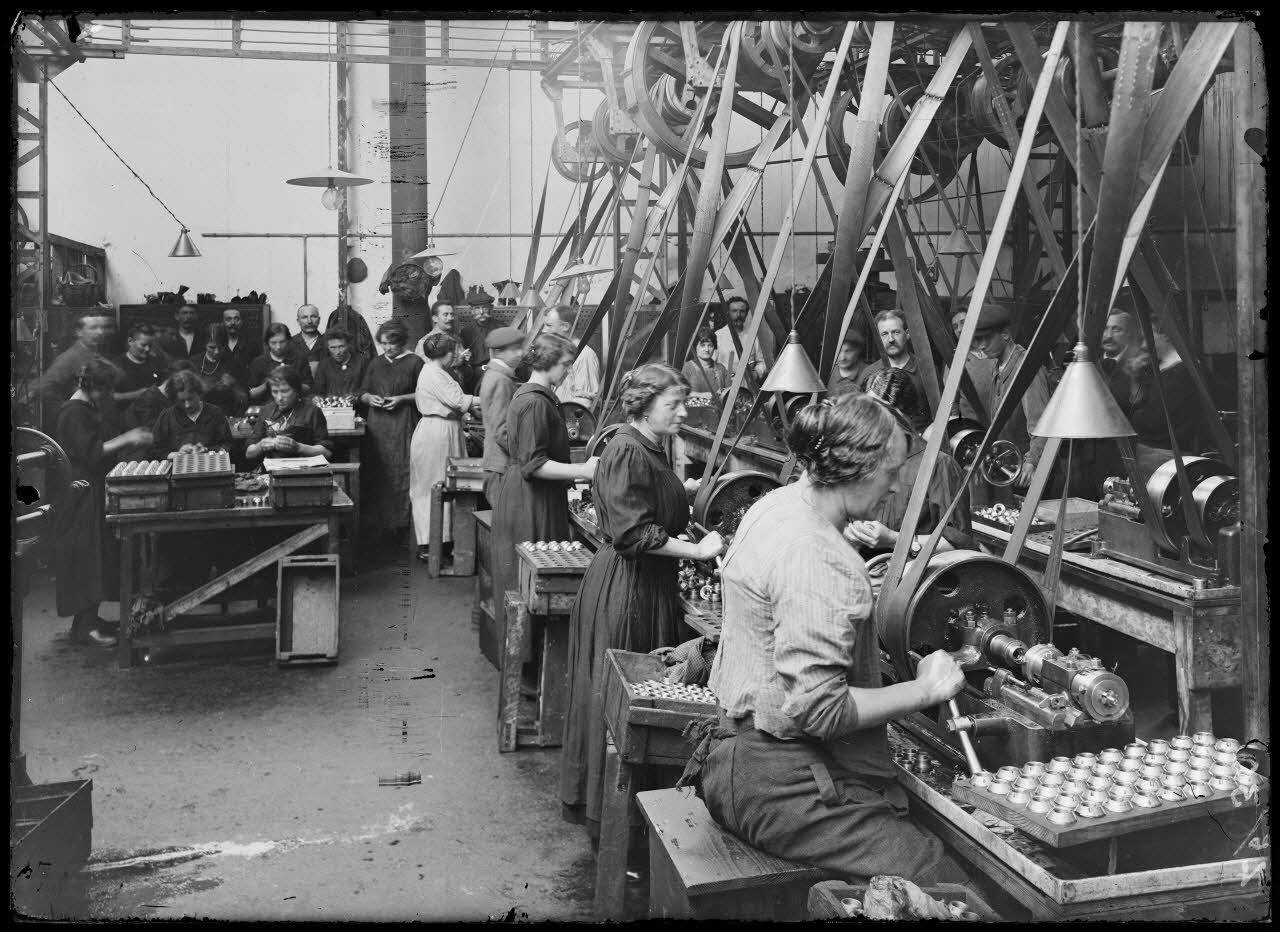 Société Eclairages électriques de Suresnes. Atelier de vérification de la conicité du culot des obus de 75.