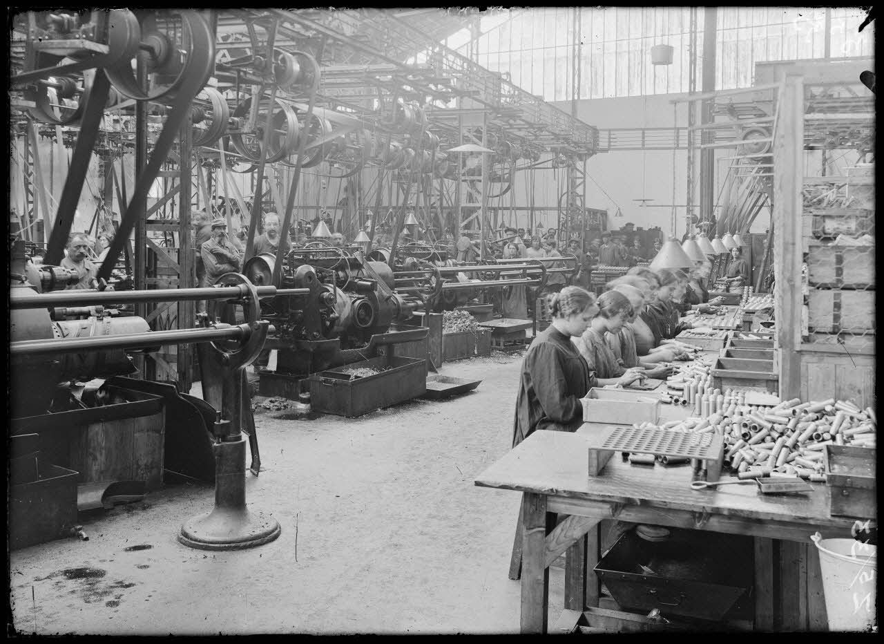 Société Eclairages électriques de Suresnes. Contrôle d'atelier. Vérification des obus de 75 avant présentation des lots à l'artillerie.