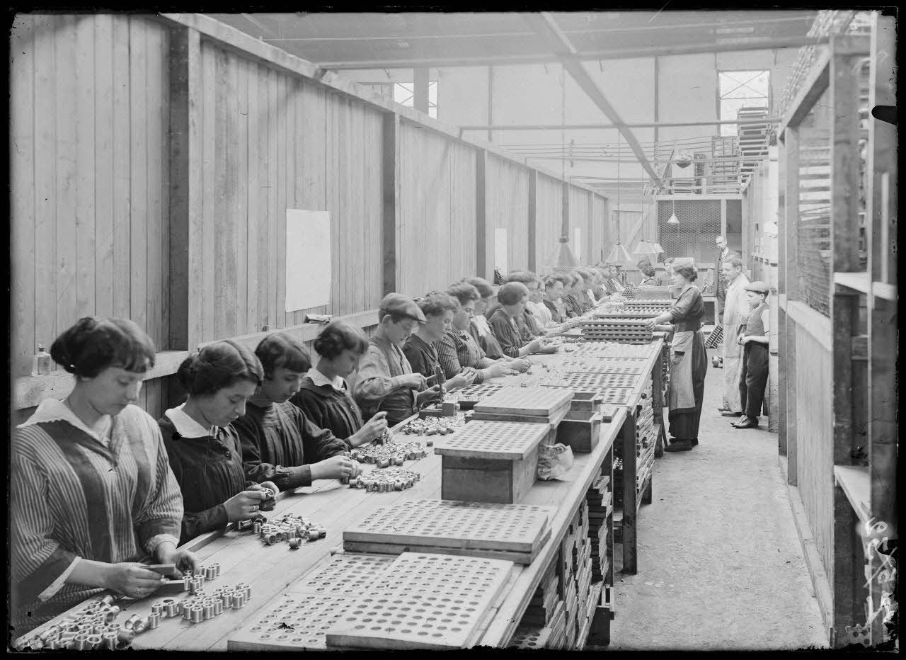 Société Eclairages électriques de Suresnes. Atelier des gaines. Contrôle des têtes, corps et bouchons de gaines sortant des machines. [légende d'origine]