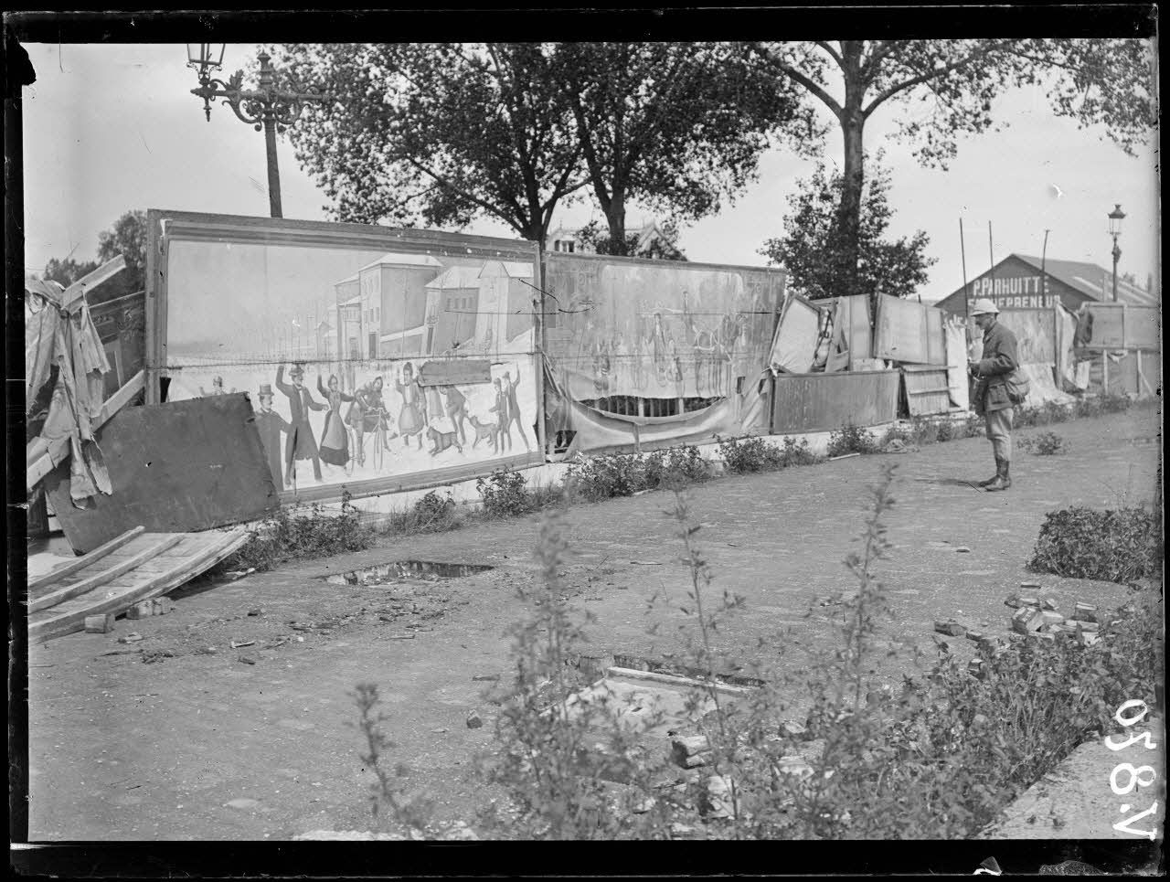 Soissons, l'arche encore intacte du pont Neuf, masquée aux regards ennemis par les toiles d'anciennes baraques. [légende d'origine]