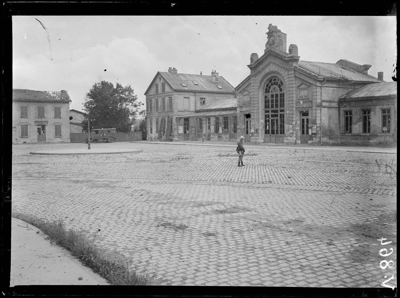 Soissons, la gare au fond à gauche. Auto équipage télégraphique allemand. [légende d'origine]