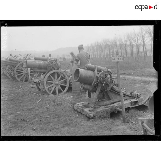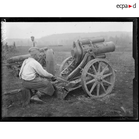 Mercin-Pommiers (Aisne). Le parc des trophées. Nettoyage du matériel pris aux allemands.