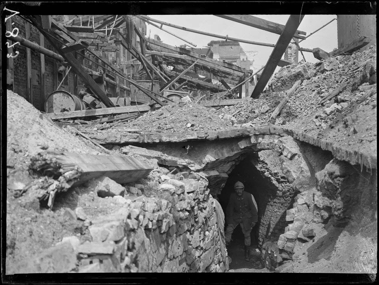 Soissons, secteur Saint-Vaast. Ruines de la distillerie au premier plan, les caves de la distillerie servant de boyau de communication. [légende d'origine]