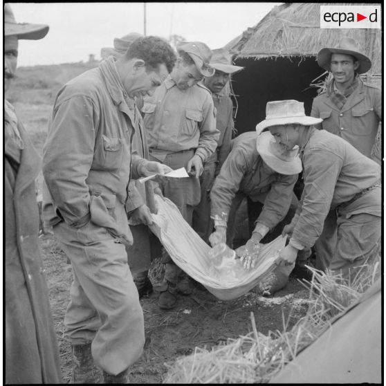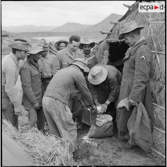 Distribution de vivres aux soldats de la 555e compagnie muletière sur le bivouac de Luc Nam.