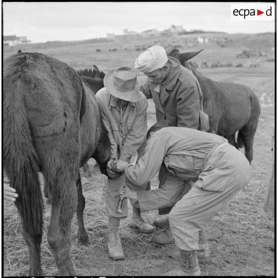 Soins apportés aux mulets de la 555e compagnie muletière.