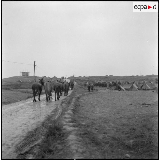 Les mulets de la 555e compagnie muletière de retour de l'abreuvoir au bivouac de Luc Nam.