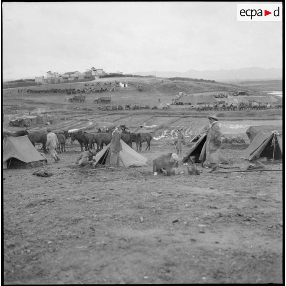 Le bivouac de la 9e batterie du 69e régiment d'artillerie d'Afrique (69e RAA) et de la 555e compagnie muletière stationnés à Luc Nam.