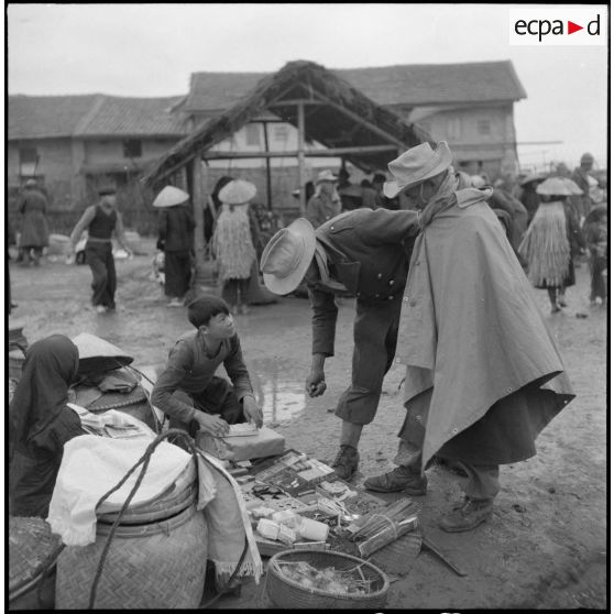 Distribution de vivres aux soldats de la 555e compagnie muletière à Luc Nam.