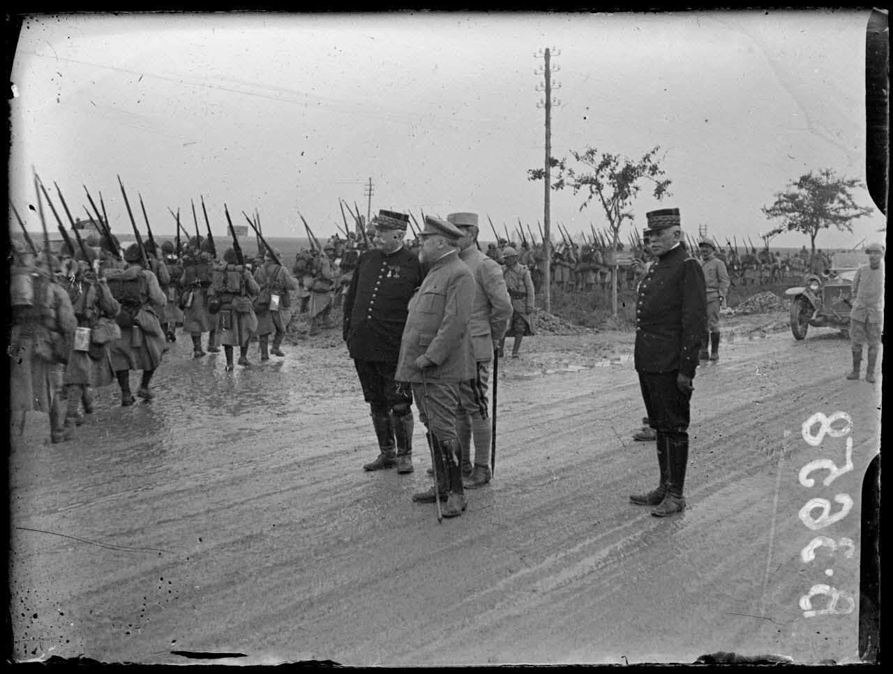 Somme. Défilé d'un régiment territorial devant le Président et les généraux Joffre, Roques et Duparge.