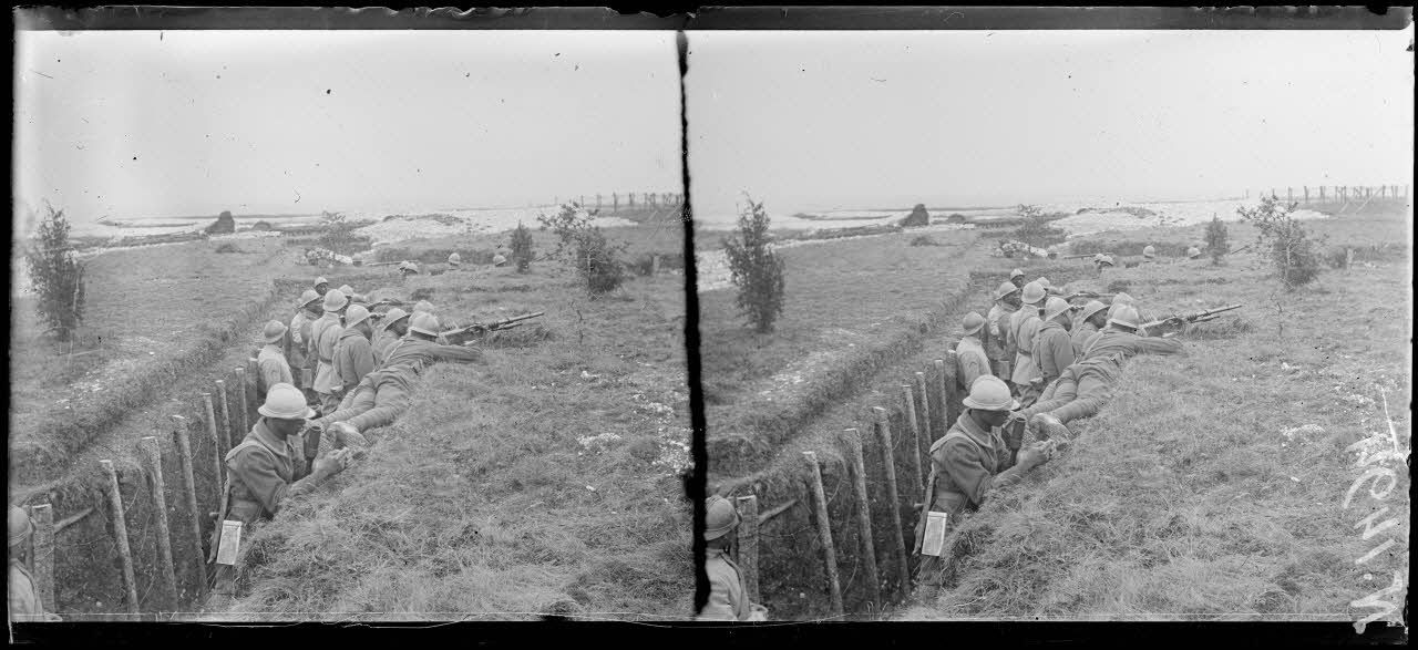 - A Sompuis, au centre d'instruction des troupes sénégalaises, les tirailleurs suivent un entraînement composé d'exercice d'attaque de tranchée, de nettoyage d'abri à la grenade, de mise en place de réseau de barbelé, de séances de tir au fusil-mitrailleur.