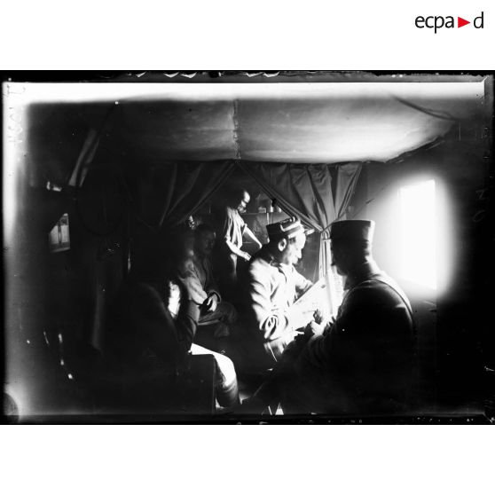 Suippes. Officiers aviateurs venant subir des épreuves de résistance des masques contre les gaz asphyxiants.