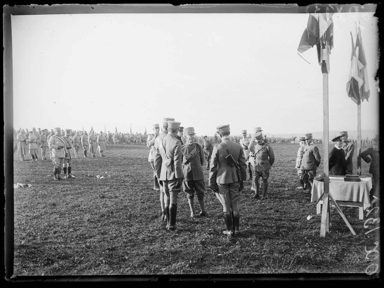 Souilly (Meuse), revue en présence du roi d'Italie. Les drapeaux de Verdun.