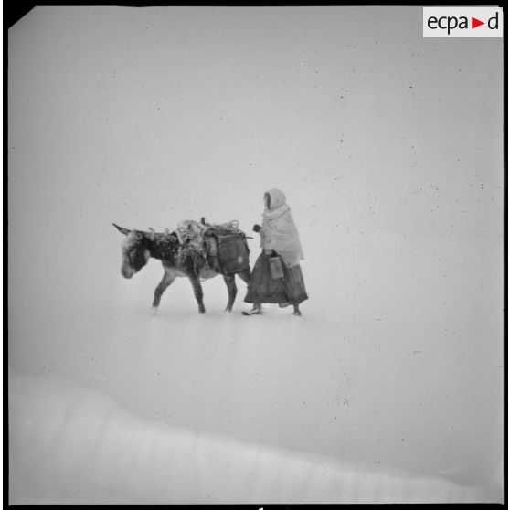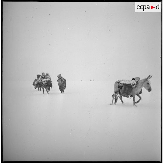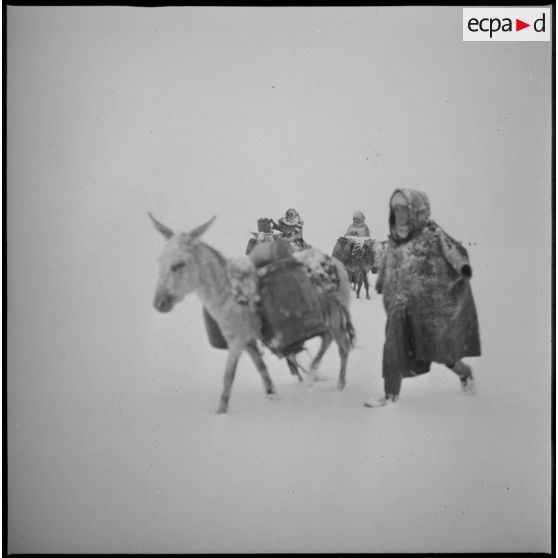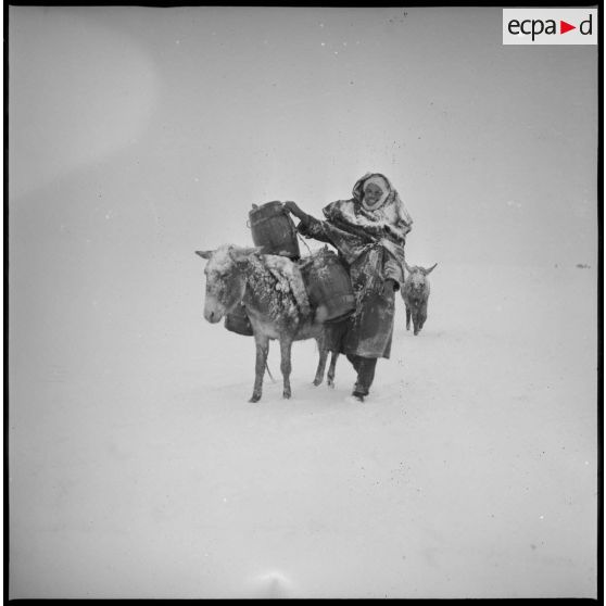 Un homme effectue une corvée d'eau sous la neige. Des mulets transportent les tonneaux.