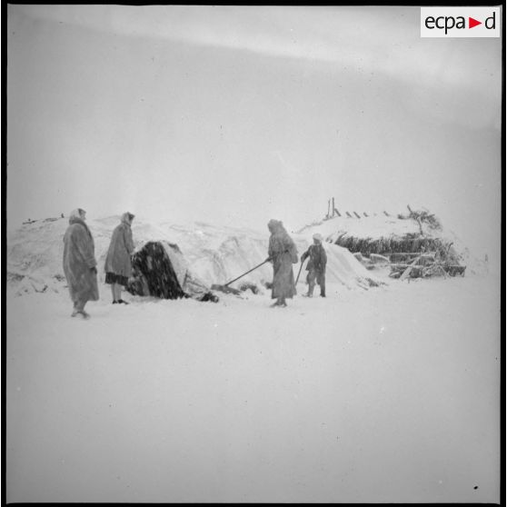 [Sous la neige qui tombe en abondance, portrait de jeunes enfants devant l'entrée d'une khaïma.]