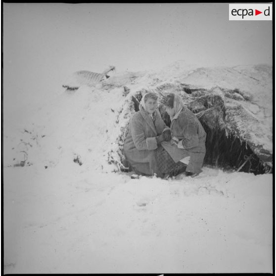 Fonds photographique de Arthur Smet (1932 - ). Visite d'une EMSI aux habitants d'une khaïma. Vie quotidienne sous la neige.