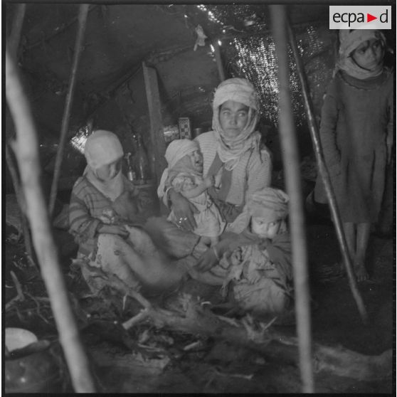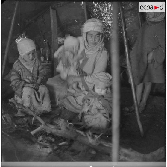 A l'intérieur d'une khaïma, portrait d'une femme et de ses enfants.