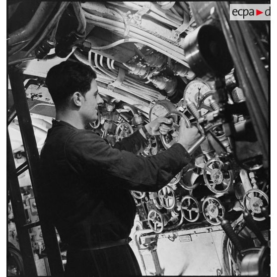 Sous-marinier de quart manoeuvrant une vanne, au cours d'un exercice, sur le tableau de commande des purges des ballasts du sous-marin des Forces navales françaises libres (FNFL) la Minerve.