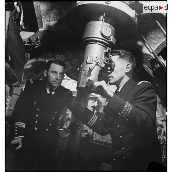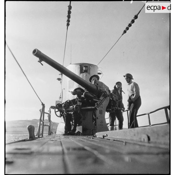 Exercice de tir antiaérien du canon de 75 mm du sous-marin des Forces navales françaises libres (FNFL) la Minerve.