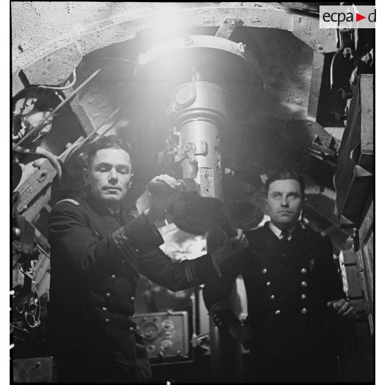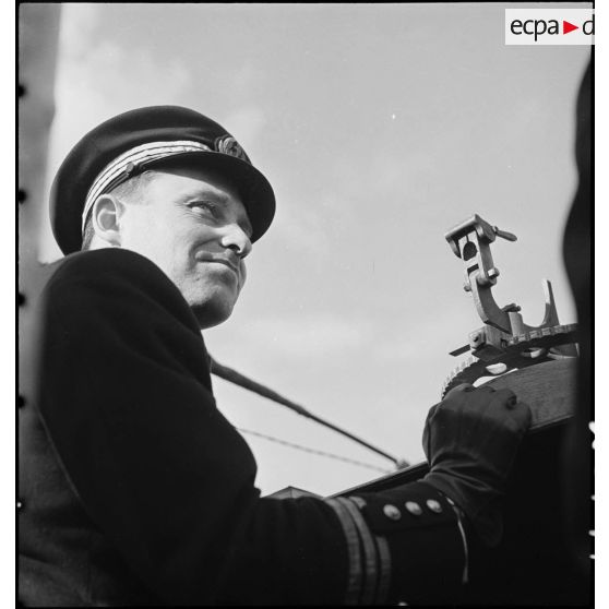 Portrait au cours d'un exercice de l'officier de 1re classe des équipages Paul Vibert, commandant en second du sous-marin des Forces navales françaises libres (FNFL) la Minerve.